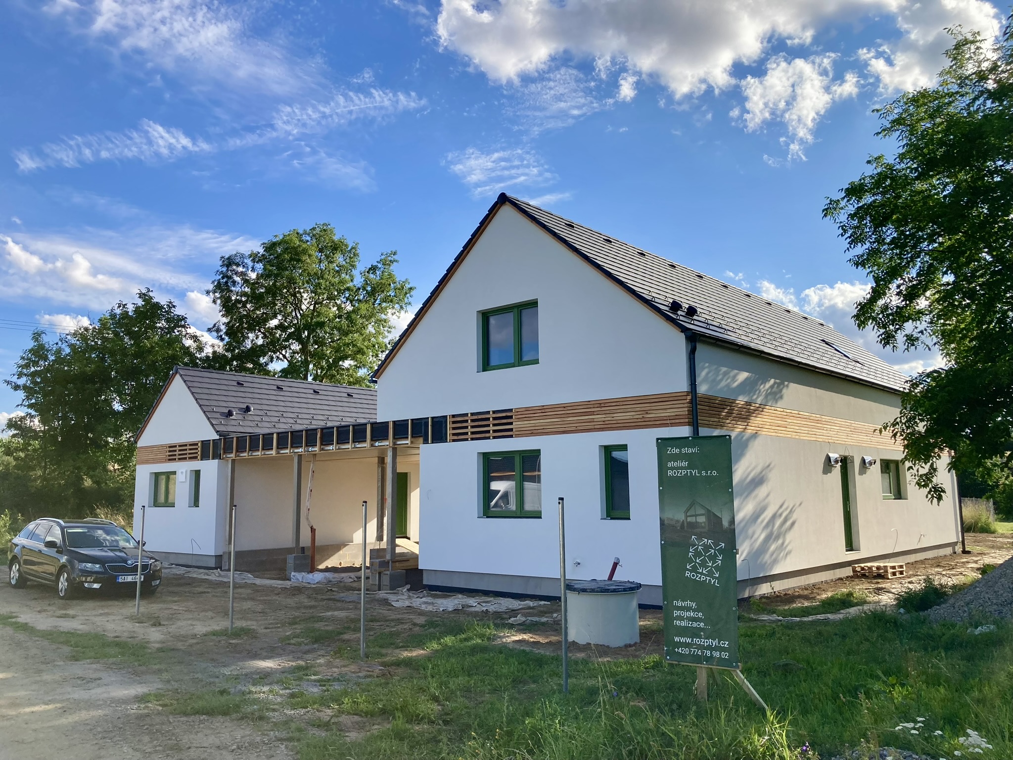 Tato dřevostavba se pyšní výraznou dřevěnou zástěnou. Hmotové řešení tvoří dva čisté bílé kvádry s dřevěnými akcenty a sedlovými střechami, které elegantně propojuje střecha plochá. Ta celý objekt sjednocuje a zároveň díky dřevěné zástěně vytváří krytou terasu i praktické parkovací stání.